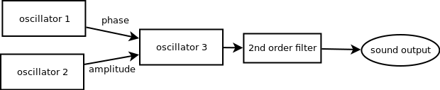 The ATTiny841 is programmed with a fixed sound synthesis patch of three wavetable oscillators, where one oscillator controls the amplitude of the third one, and another the phase of the third one. Then after the third oscillator there is a 2nd order filter. Then the result is sent to a DAC, connected to a small amplifier and the speaker of the module.